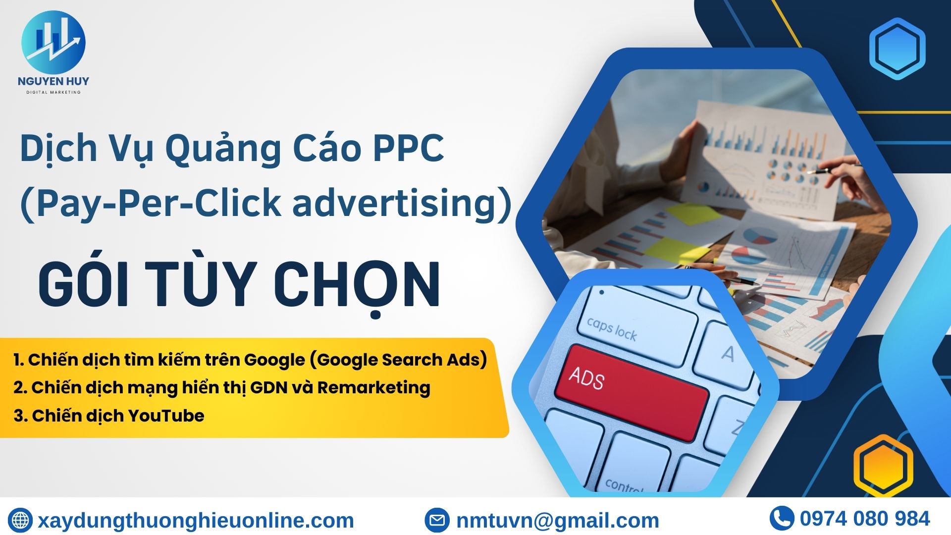 Digital Marketing Nguyễn Huy sẽ giúp Quý khách tùy chỉnh ngân sách cho chiến dịch quảng cáo PPC một cách linh hoạt, phù hợp với mục tiêu kinh doanh và ngân sách thực tế của từng khách hàng. Chúng tôi cam kết mang lại hiệu quả quảng cáo cao nhất, với quy trình làm việc chuyên nghiệp, minh bạch và báo cáo chi tiết.